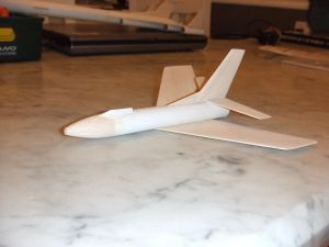 The glider construction is a bit easier although it shares many of the same basic steps. First, the rudder is another 2-piece fin assembly. The wings are also 2-piece but don't allow the glue to set--they are mounted draped over the body tube with the tips touching the table to create a dihedral.