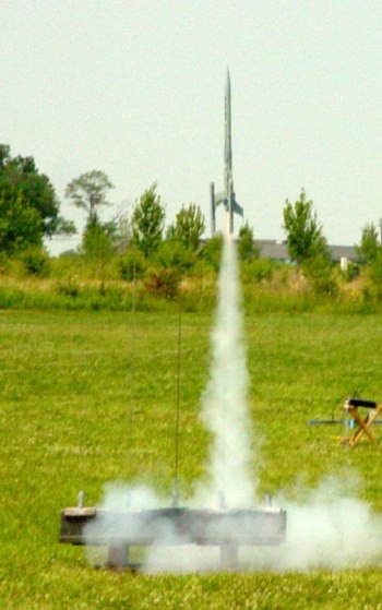 With the big fin area and weight of the rocket, I was expecting a slow flight. It surprised me by shooting up fairly quickly although it weathercocked a good bit into the 5mph winds. Deployment was definitely early and the -5 delay would have been a better fit. I'm not too good at estimating low altitudes, but I would put this in the 350-300 foot range.
