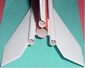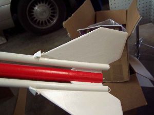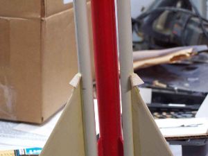 When the red paint was dry, I sanded down the outer root edge of the little fins to insure adhesion with the glue. The motor tube and the 2 BT-5 chute tubes were then test fit into the centering rings. The BT-5s fit fine but the center holes needed to be sanded a bit to accommodate the BT-50. When they fit, I took them all apart again and measured 4" and 1-5/8" from the front of the motor tube since the previous marks had been covered by the paint. A razor knife was then used to scrape away the paint where the rings were to go. The pieces were put back together again and aligned to the marks. Care has to be taken to see that the small fins also align with the three BT-5 tubes. Rubber bands came in handy at this point. I glued the rings in place with white glue and applied the first layer of a double glue joint to the bottoms of the BT-5s and small fins. When the first layer had dried, I glued the fins to the BT-5s and used some masking tape to hold everything in place as the glue dried.
