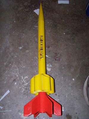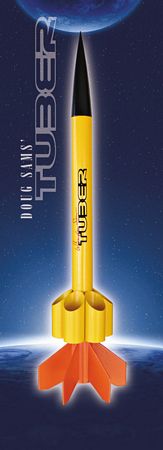 The Tuber is a two stage rocket. The lower stage features 6 conventional fins and it joins to a tube finned sustainer. Both motor mounts are 24mm. The booster tumbles and the sustainer comes down on a streamer.