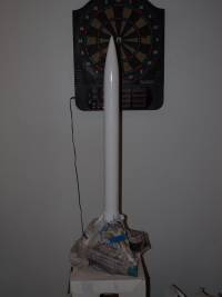 The rocket was flightworthy soon after I started the project, but because of the tumorous fillets and difficulties reproducing the BT-20 decal at BT-80 size, it would be four years before I finally dragged it out for the first flight.  It had been sprayed with Valspar gloss white all that time, but with the launch scheduled for the next day and with barely enough purple spray paint to get enough cover to suggest the purple aft section of the rocket, I did a quick spray until the rattle can blew air.  From twenty five feet it looked okay.  If you squinted.  Let's not talk about close up.