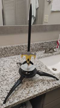 The launch pad is very basic, in that it does not provide a way to angle the launch rod. Decorated like a piece of Imperial engineering, the pad has some fragile details that would not sustain much field abuse. Clearly, of course, this starter set is not meant for a lot of use - rather, a quick introduction to the hobby, and a tie-in to the movie. There are two features of the launch pad and rod that make this even more foolproof than usual. The two-piece launch rod has a plastic fitting at the end that locks into the launch pad, and a crimp that acts as a launch lug stop to hold the model above the deflector plate. The pad legs snap into place, and are not really meant for subsequent disassembly.