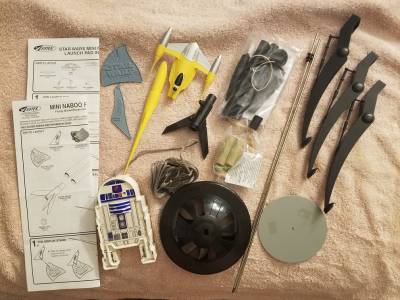 This is a long OOP Estes starter set from 1999, a tie-in with Star Wars Episode 1, The Phantom Menace. The kit consists of an almost-read-to-fly (ARF) model rocket, a plastic Naboo Fighter with display stand, a simple Star-Wars styled launch pad and launch rod, and an interesting launch controller shaped and decorated like R2D2. The set comes with two A10-3T engines and ignitors (starters), plus a single square of recovery wadding.