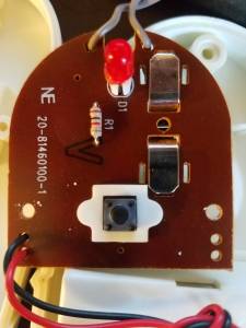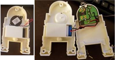 The oddest feature of the R2D2 launch controller is on the back: a stubby cylindrical projection with many holes in it. It seems that the designers planned to include an audible continuity alert - maybe even "droid sounds" - but abandoned it. Opening the controller, the speaker / sounder well was covered with a glued-in cap with a hole likely intended for lead wires. Opposite this speaker well is a small circuit board holding the LED and resistor and the contacts for the safety key. The launch button is a section of R2's body - a spring-loaded plastic section that makes contact with a momentary pushbutton switch on the circuit board. The cap glued into the speaker well has a small knob that supports the circuit board under the pushbutton switch, ensuring secure contact. For such a simple item, I was impressed with the engineering details.