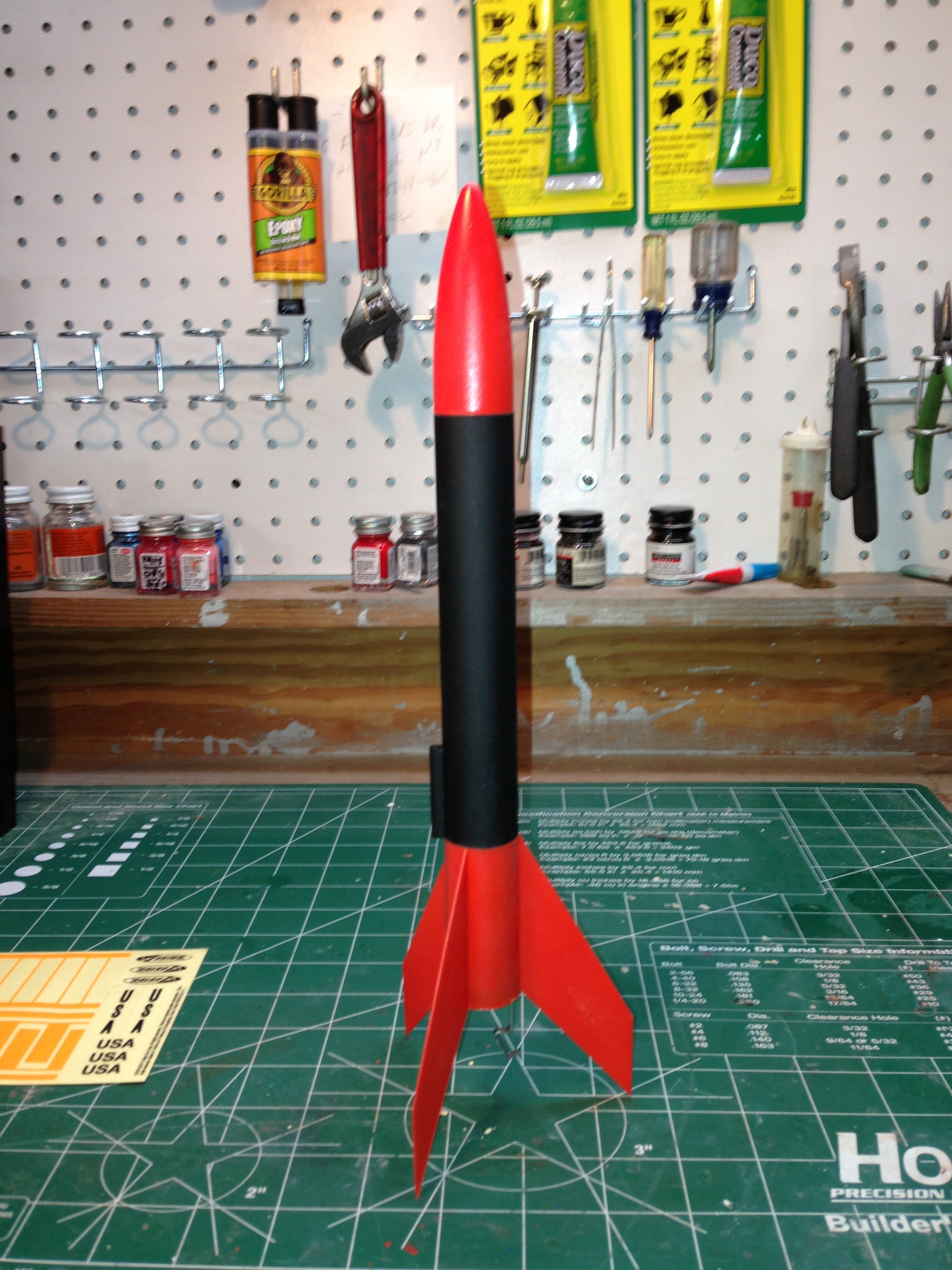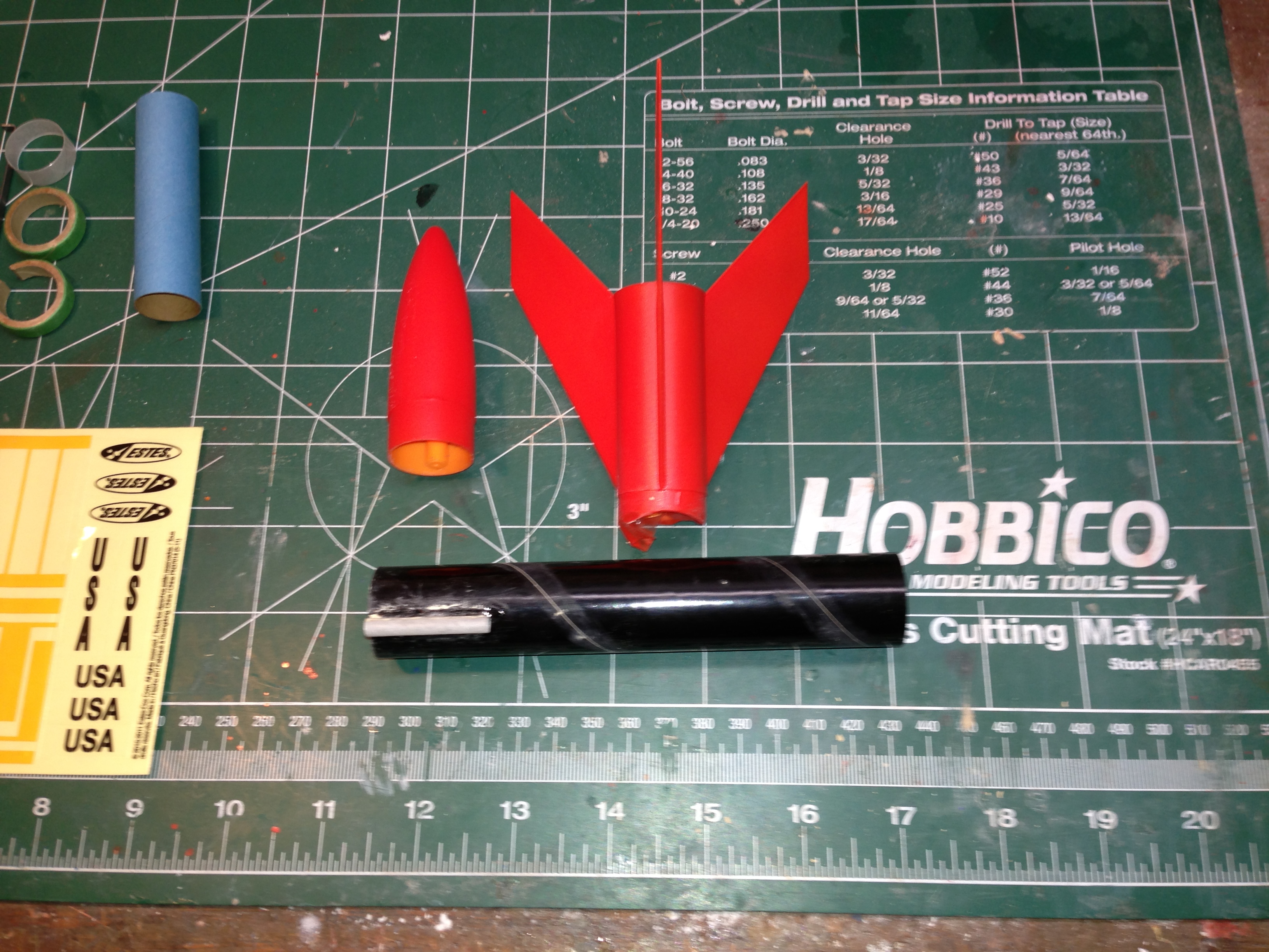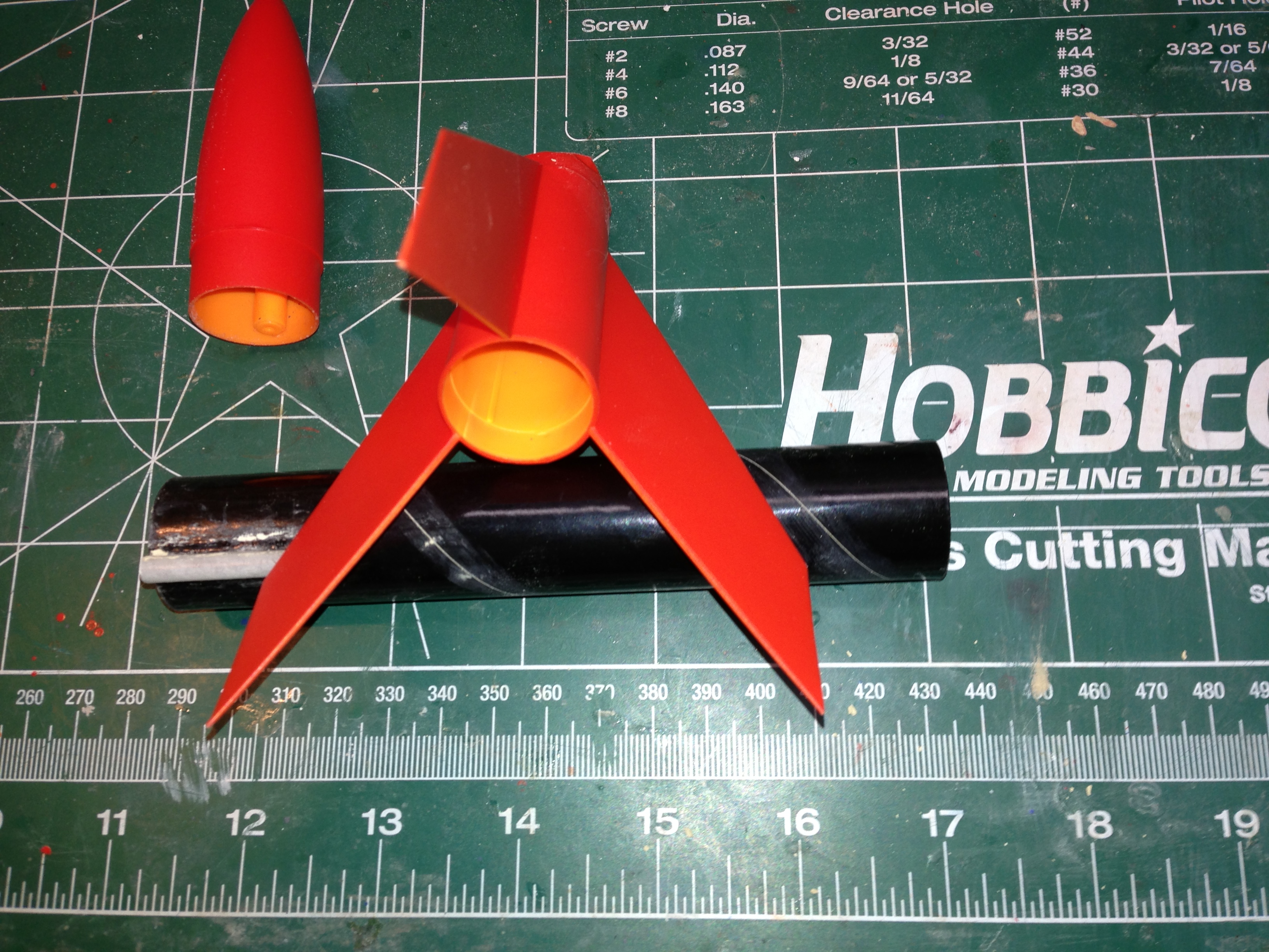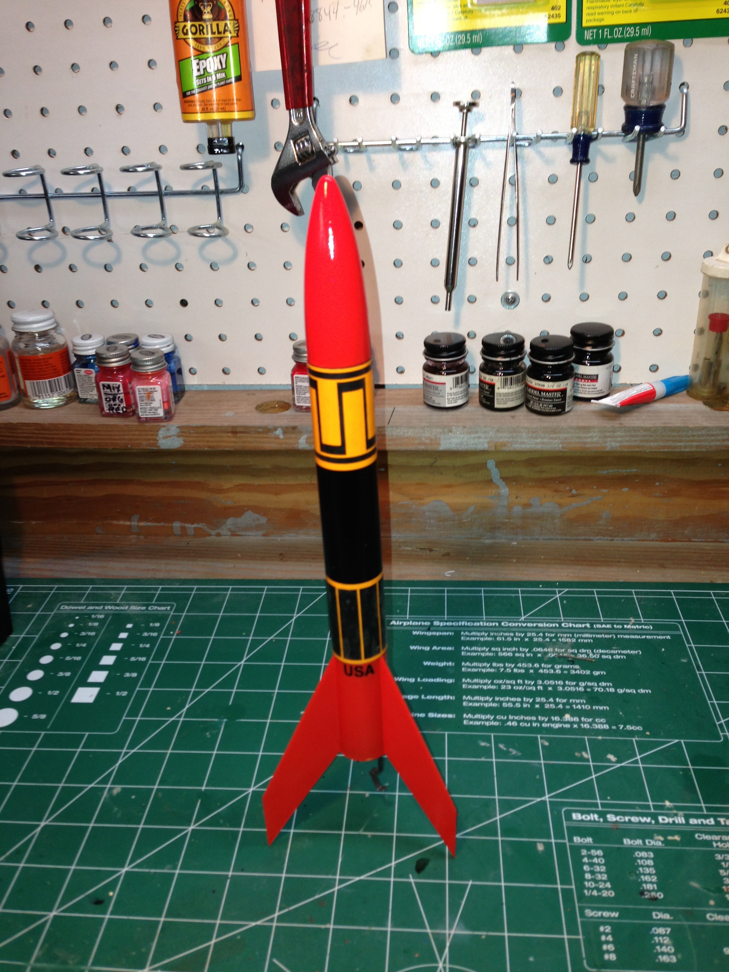 Brief: About the most simple there is. It's pretty much just a black gloss body tube, orange plastic nose cose, and one piece (3) fin unit. 12" Estes parachute. Modifications: Upsize of launch lug. Construction: This is a super simple rocket kit that can be built in less than 30 minutes with just CA (super glue). When building mine, I replaced the launch lug with ...