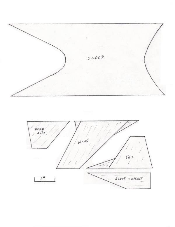 Construction began as with most Estes rockets with the motor mount being put together and then glued into the tube. Bottom centering ring was glued flush with one end of BT instead of recessed as the Baby Bertha calls for. This was done to make it resemble the Snarky mounting. BT was then marked for wings, tail, stabilizers, scoop and scoop support. Now is when the real fun began. I took the original scoop pattern from my Snarky to work and ran it through the copier at 50% reduction to get a rough pattern to use for the Goony version. Next up was re-configuring the balsa and fins to make the wings, stabilizers, tail, and scoop support. I took the stock fins of the Baby Bertha and modified them to resemble the wings of the Snarky. The same was done with the tail and stabilizers. Scoop support was cut from left over scrap. Here's a copy of the patterns that I used.