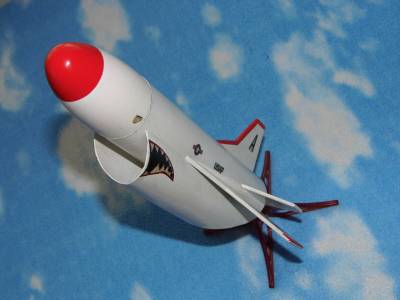 After construction was finished all seams were gone over with white glue and then after drying any left-over holes were filled with Hobby-Lite. Base of rocket then got two coats of Rust-Oleum 2x White Primmer with the usual drying and sanding between coats. Nose cone was then placed back on and entire rocket got two coats of KRYLON FUSION FOR PLASTIC white paint. Rocket was then set aside to dry over night and I turned my attention to the decals for this bird. I looked for the appropriate size markings on the web and copied them but had a little trouble finding a P-40 Flying Tiger mouth that I liked and would fit on the scoop. The eyes for the NC were another. After findings ones I liked and fine tuning them in Windows Paint, I printed them out on standard printer paper and then applied a couple of light coats of clear paint to them and set them aside to dry as well. The following day I took the NC and carefully masked off the back 1 3/4" in order to do the red tip. The wings and tail were like wise masked off for the red stripes. These were then sprayed with two light coats of Krylon Bright Red and NC placed on a wood dowel and given the same treatment. After allowing all to dry for an hour all tape was removed and rocket again set up to dry over night. Final day of finishing was started by taking the NC and doing a light wet sand with 1000 grit paper to smooth paint line between red and white paint. The wing tips and tail were done as well and then the rocket got a complete wipe down. I then proceeded to cut out the decals. These were then trimmed and attached using a glue stick. After waiting an hour for glue to dry all decals were double checked and entire rocket was given two coats of Krylon Clear Gloss.