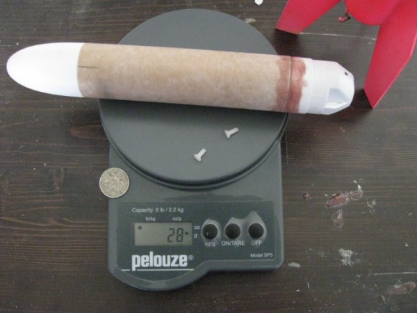 My BBPC rocket weighs 5.25 oz. ready to launch with no motor. An E9 motor weighs 2 oz. This gives you a 7.25 oz. ready-to-launch platform WITH 10 cubic inches of cargo space! Future refinements will improve these numbers. I read somewhere that Estes has produced the Big Bertha for 30 years.--It is easy to see why.
