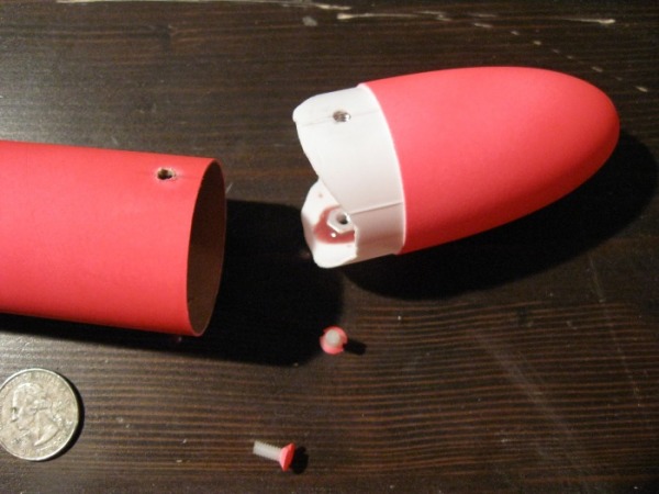 The base of the BBPC is the bottom portion of a NC-60 nose cone epoxied onto a BT-60 tube. A 3/16" balsa cargo floor is put in just forward of the nose cone base. This is to protect the cargo from the recovery blast. A second NC-60 is modified for the cargo door/nosecone by removing the lower portion and epoxying two 6-32 aluminum nuts that accept 6-32 nylon bolts onto the nosecone flange. These nuts/bolts are available at any Home Depot for less than a dollar. The nylon bolts secure the cargo door/nosecone to the BT-60. Thats it! Stuff what you can into the 10+ cubic inches of cargo space and hope you have enough impulse! Lets go!