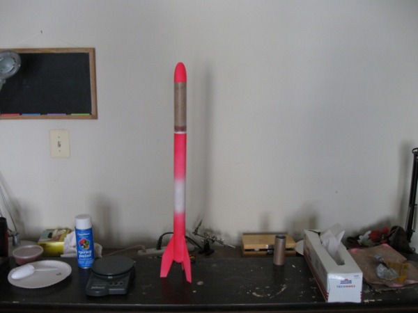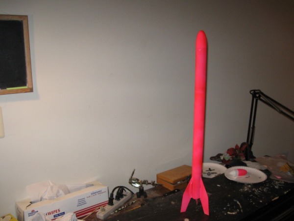This is a scratch 2X upscale of a popular Estes kit. It features a 3 inch diameter body and PML components (except the nose cone, which was turned on a lathe out of solid pine). It weighs 3.5 pounds and is 45 inches tall. A 36" long, 3" diameter quantum body tube was ordered with fin slots ...