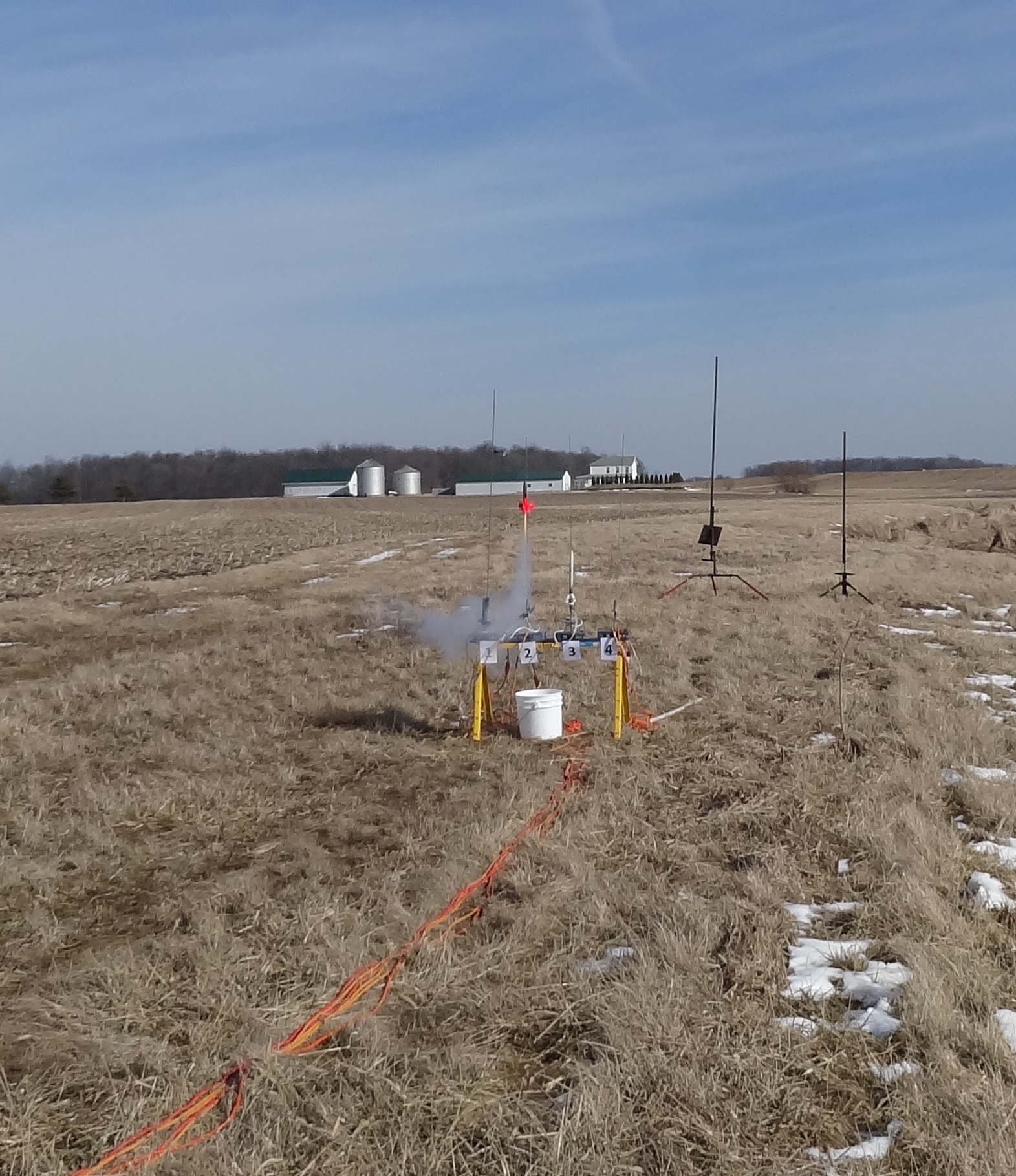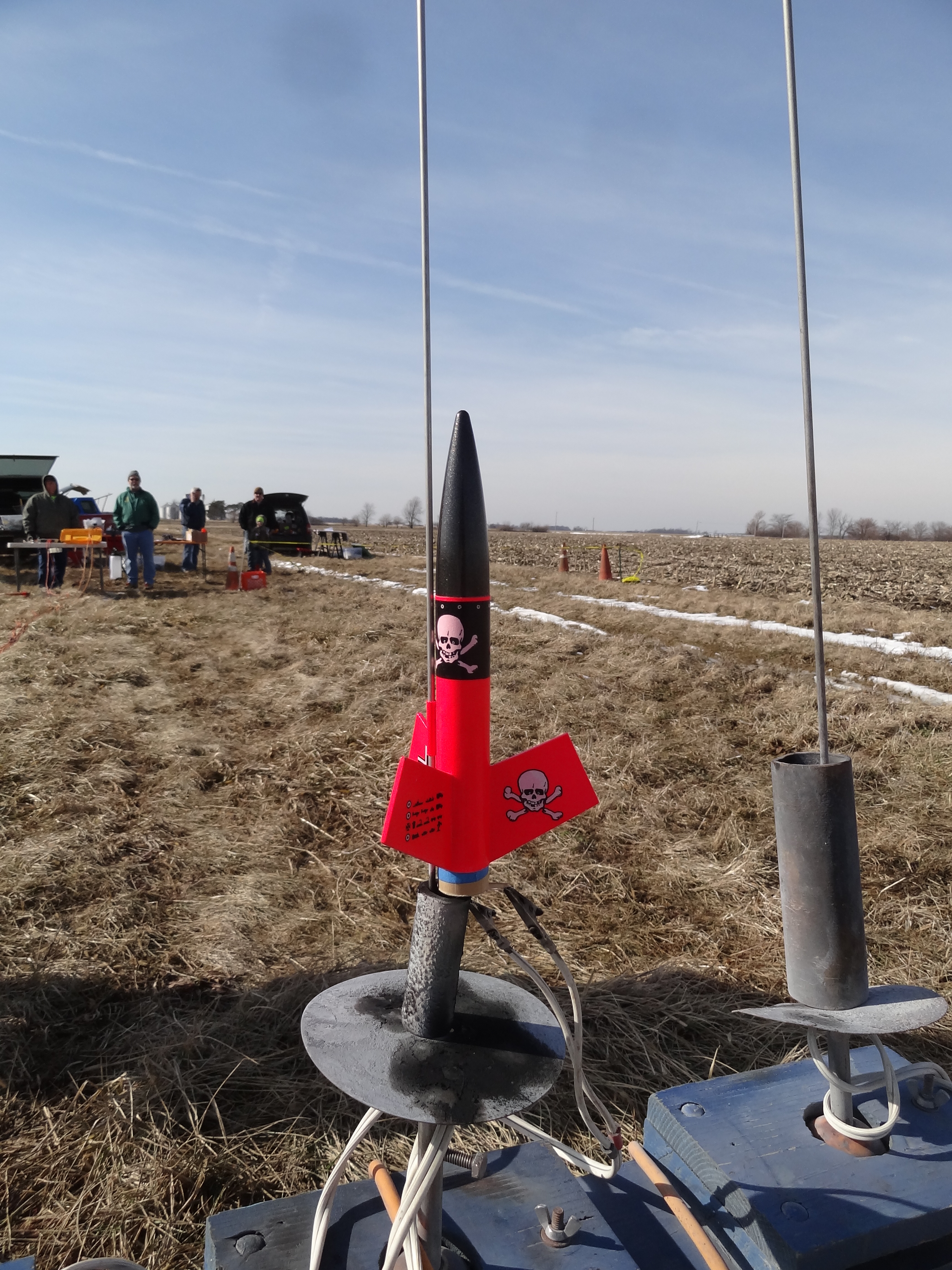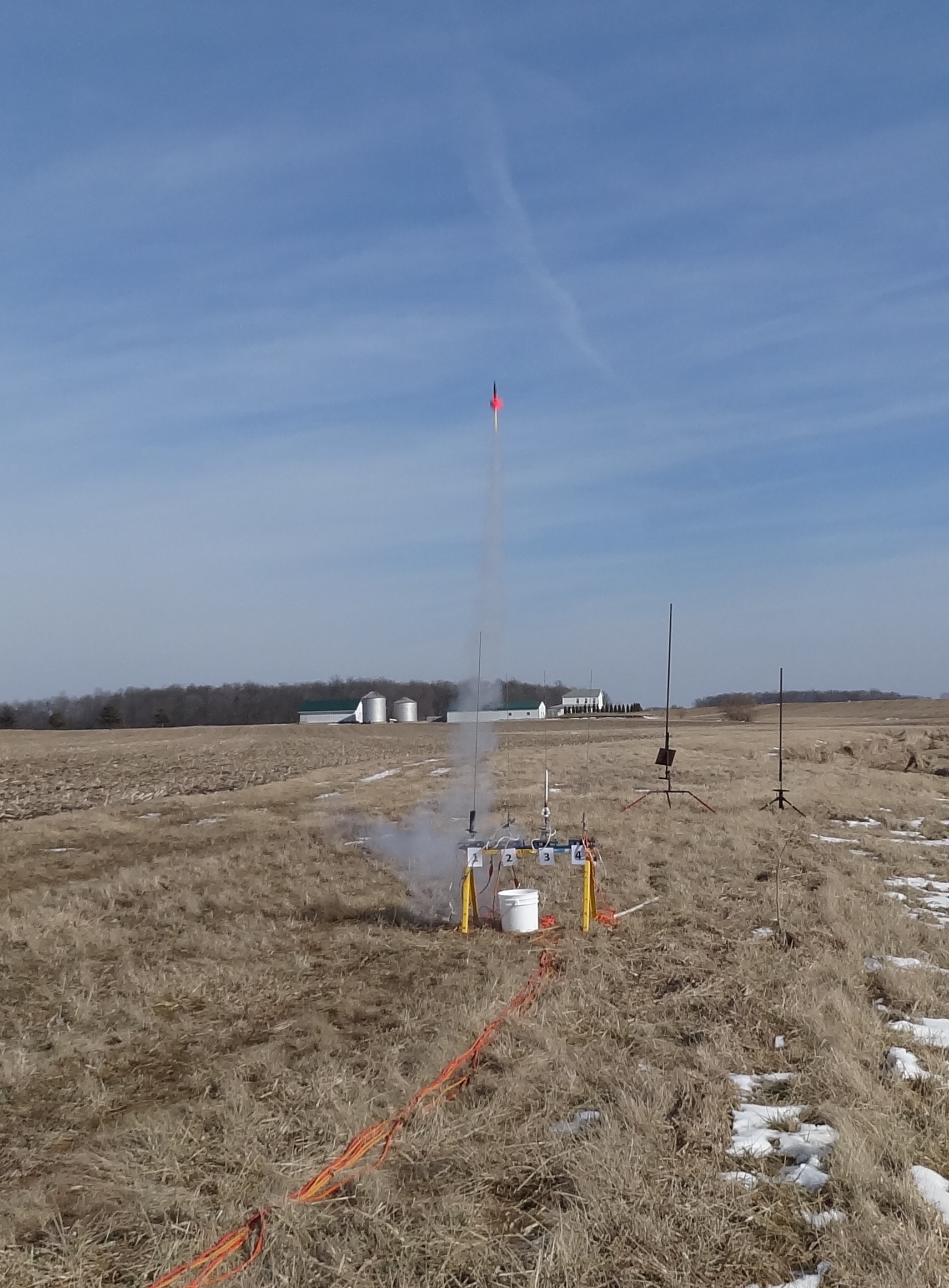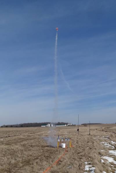 This was in no way a B6-4 Field flyer, so I had to wait for a cornfield launch to make the first flight.  A WSR cornfield launch was scheduled in Cedarville, Ohio for February.  I'd not previously flown in this field because I wasn't sure the entrance could be navigated successfully by my Hyundai sedan, but on this day launch fever drew me to make the attempt.  I took it slow, and there was some scraping, but I made it down the path to the parking area.  I found the field frozen, but thawing and quickly turning to muck.  The Mega Mini Max would be my last flight of the day, and it would be a memorable one.  I loaded it with a C11-7 because it was the only 24mm motor I had with a 7 second delay.  I was using a new camera and was very interested in trying out the burst mode.  Boy did I get burst.
