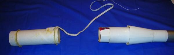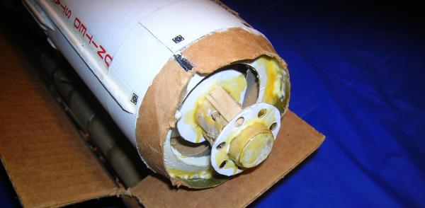 2) Parachute tube is a much larger "mail tube," about 2 1/8" in dia., cut in half. Mounted second shroud in "front half" of mailing tube, w/transition to the BT 50.