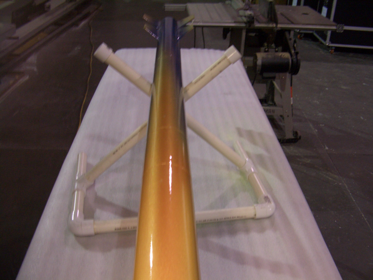 For priming I use their fillsetting type of Polyester primer. This builds quick, dries fast and sands within an hour. This is almost the equivalent of adding glass to an airframe. If I added a 'sock' to the tubes, I am sure it would have the same effect. On this build I chose to use some ND, go Irish Hockey that is!, colors I had laying around. I went with a solid blue color and worked 2 different tones of gold flake up and down the tube. The supplied vinyl decal would not look good with the color combination so I asked Scott if I could get the file so I could recut it out of a different material. He put me in touch with Mark from Stickershock, another grade A+ customer service vendor, and the file was on its way! I cut the logo originally provided out of a hand turned goldleaf and applied it. 3 coats of gloss clear later to seal everyhting up and give it a nice shine and.... Done!