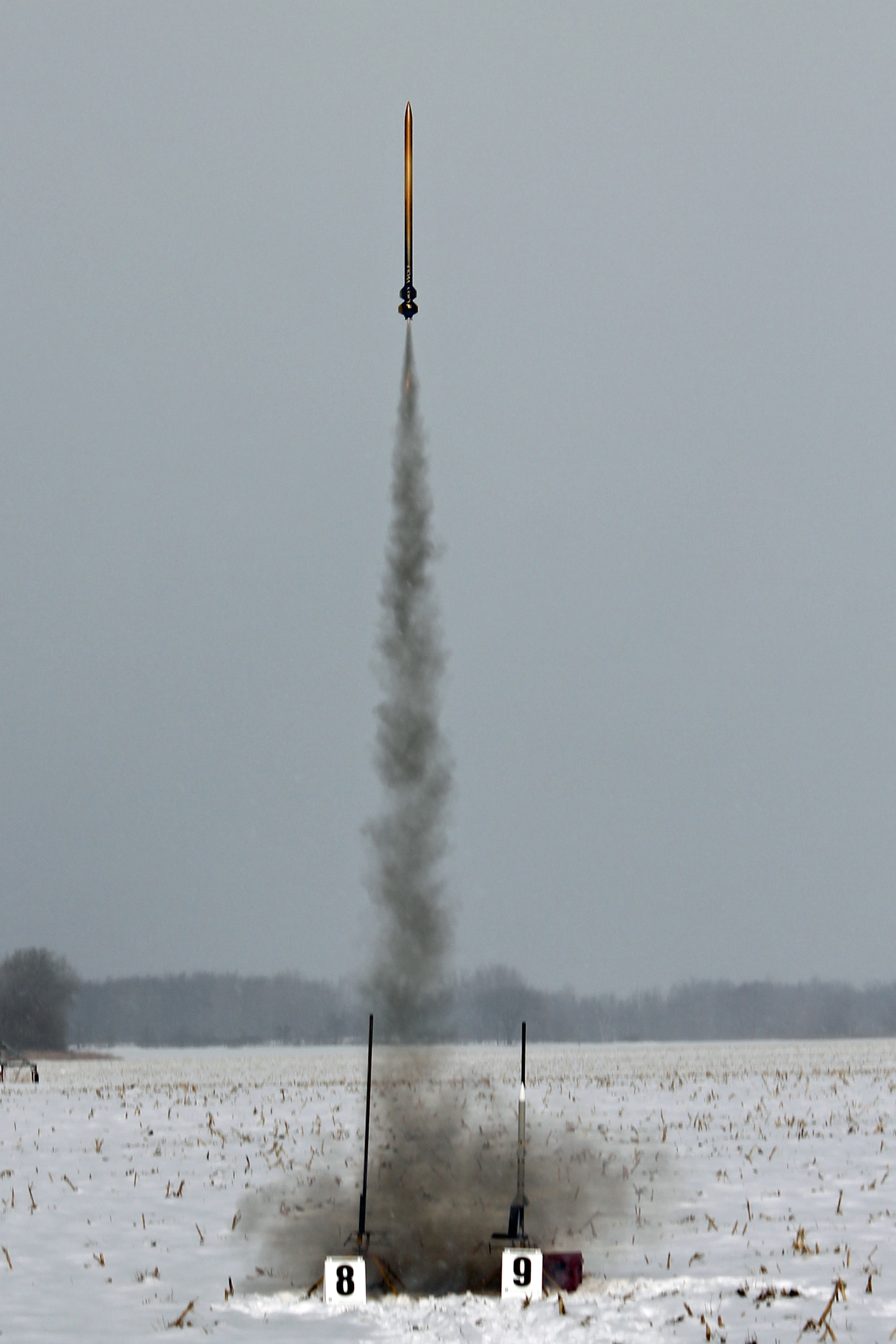 This was a blustery cold day, ceiling was at times obstructed with lake effect snow squalls throughout most of the day. I prepped the rocket, installed my RRC2 mini and started on the quick build of a Kosdon 38/390 I300 fast propellant load. I probably should have waited for the nicer clear skies we encountered later but in our area you never know what is going to happen so off to the pad she went. Flight was a rip off the pad and straight up into a upper level squall. We lost sight as she entered but luckily heard the first event and everyone started panning their view and listening for event 2. Event 2 occured and we picked her up gently coming downrange into another field. No damage, nice straight true flight and about where the sim predicted.
