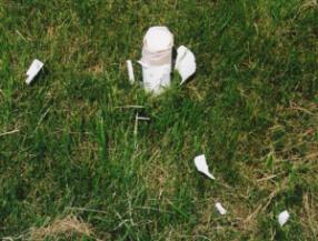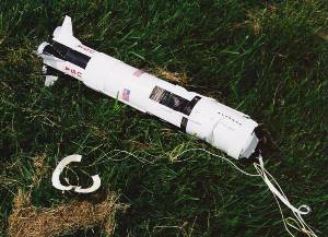 For the maiden flight, I selected an F40-4W RMS. It was magnificent - the Saturn ripped off the pad with the characteristic roar and smoke of a White Lightning motor. It climbed to about 500 feet, hung there for second before it slowly arced over, then came back to earth ballistic. That's right, a complete lawn dart - the ejection charge never fired. Worse, since it was an RMS, it was probably my fault although I don't know what I might have done wrong (I've launched a large number of RMS motors and this is the first time the ejection charge has failed to fire). The impact utterly destroyed the upper half of the rocket (basically everything down to the inter-stage wrap). Surprisingly, the resin Apollo capsule was the exception - it survived almost unscathed, just a (easily repaired) break in the escape tower (although it took a couple minutes to dig the capsule out of the crater). The engine mount held up surprisingly well - the forward bulkhead was broken into several pieces and the upper couple inches of the engine tube were buckled by the impact - but the rest of the mount was undamaged.