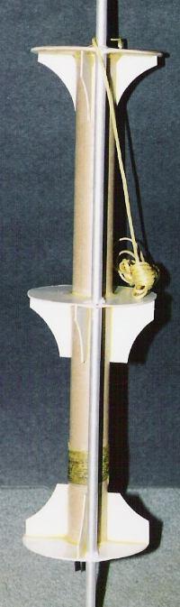 To build the engine mount, I started out with the stock centering rings, enlarging the center hole for the 29mm mount tube. I then took the top and bottom centering rings, and laminated 1/64" plywood to both sides of the rings - cut the plywood to size, glue to the centering ring with yellow glue, wrap in waxed paper, and place under some heavy books to dry. After installing the engine block and hook but before I glued the (laminated) centering rings on the stuffer tube, I stacked the centering rings and drilled a 11/32" hole through all three for the internal launch lug, with the outside edge of the hole 1/8" in from the outside edge of the ring (to clear things like the coupler to the upper stage). When I glued the centering rings to the stuffer tube, I used the aluminum tube to insure alignment of the holes. Gussets were then cut from the scrap centering ring card stock and glued in place to support the centering rings. After attaching a ten-foot length of .100" diameter Kevlar shock cord to the front of the engine mount, the whole assembly was liberally filleted with yellow glue.