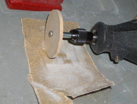 Chuck the disk into a Dremel tool collet. Use 100 grit sandpaper to smooth the edges and make a generally round shape. The exact shape and size is not critical.