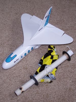 The first two flights were with the B6-2 and both were nearly identical. Very straight boost with ejection of the engine pod at apogee. The pod returned on the stock Estes chute with a spill hole. The glider came down in a nice circular pattern and made a clean landing.