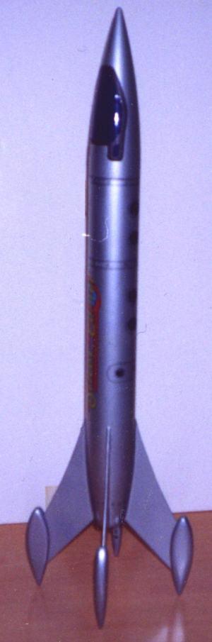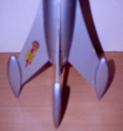 Re-finishing the Silver Comet was a real chore. I thought at first that I'd preserve the original paint job and just paint the fin tips and new body tube section. But after sanding, sealing, spiral-seam-filling and spraying the new parts, the contrast between new and old was too obvious! I ended up sanding and priming the old parts and doing what I could to fill the fins. The result was pretty good. I was never good at achieving "chrome" like silver finishes, but after buffing and a few coats of Future floor wax the finish looks really nice. Sort of a "silver plastic" effect. When the paint was dry, I reapplied the decals. The original kit calls for the "portholes" and hatch to be placed on one side and the logo decal on the other. I decided that this was too unbalanced looking. So I called Estes Customer Service and tried to order another set of decals. They refused to sell me one . . . they sent me one for free! God bless 'em! I placed the new set of porthole and hatch decals on the port side of the ship, and the logo detail along the top. As a finishing touch, I used dark blue acrylic paint to color in the center of each porthole and the hatch's window. The result is an amazing improvement over the original look. (If you've got a Silver Comet, try it!) I tried painting in the cockpit windows, with limited success. I eventually settled on using pieces of blue Trim Monokote. This wasn't much better, and took a lot of work. I think I'd try harder to get a good paint finish if I had to do it over again.