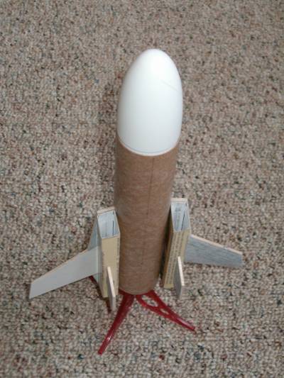 Painting was a snap. Shoot entire rocket with Rust-Olium 2x White Primer, sand, and hit it again with some more light primer followed by two coats of Krylon Gloss White. The only hard part was the Flat Black in the pod ends which I did with a small paint brush. The decal around the main BT had to be run through Windows Paint to stretch it in order to fit around the BT-60 tube but all others were printed out as is except for a slight color change. Decals were then clear coated and when dry cut out and attached with a glue stick. After making sure no decals were loose rocket was clear coated with Krylon Clear Gloss to seal decals.