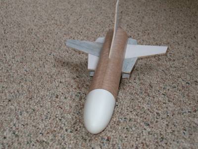 Construction for the most part was per directions.  Step 1 saw the addition of paper coating being applied to all finished wood assemblies. Steps 2 & 3 were done as though I were building a Baby Bertha. Step 7 was slightly difficult as I didn't have a guide for the BT-60 body tube so had to make one. On Step 8 I forgot to glue on the lunch lug as I stared getting ahead of myself and proceeded with Steps 9, 10, & half of Step 11. Step 12 was skipped due to addition in Step 1. It was after Step 13  that the launch lug and ventral fin units were glue on as can be seen in the photo. Followed Steps 14-19 in order to finish the build. The only Con: was having to copy all the parts on to paper first then gluing the paper to new wood making sure wood grain matched patterns and then cutting out all parts with an Exacto knife and Hobby saw.