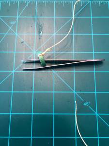 The card stock fins seemed a bit flimsy so they were laminated with paper.   Six pieces of paper were cut a bit larger than the shape of the fins so there would be over-hang.  Using an elmers glue stick, apply glue to one side of the fin.  Apply the paper in a sweeping  motion from left to right.  A plastic kitchen bench scraper was then used to drag and smooth out the paper.  Repeat on the other side and for the remaining fins.  Fins were left underneath a heavy book overnight to dry and stay flat.   The next day a hobby knife was used to trim off the excess paper.  Thin CA was applied to seal the edges and then lightly sanded smooth.  Please note that super glue was not applied to the fin edge that would be glued to the body tube. Fins were attached to the body tube with a bit of thick CA.  Titebond II wood glue was then used to apply fillets.