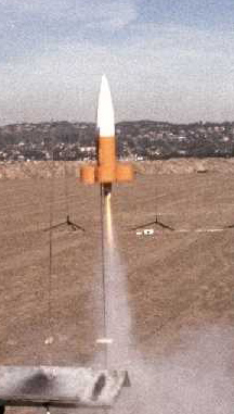 First flight was on an Estes D12-3, uisng a LOC 24-29mm adapter. Perfect boost to about 300', followed by perfect recovery on its 24" Top Flight "Lite" chute. It amazes me what a small space these "Lite" chutes fit in to, but lots of dog barf (or a Nomex shield) is essential or they melt from touching any ejection gas. 2nd and 3rd flights were to about the 900-1000' my SIM predicted on AT F21-6 and F23-4 motors; perfect again, despite a good bit of wind. By the next weekend at Fiesta Island, I had gotten pretty cocky with my new toy, so I took advantage of calm conditions to load in an F50-9 (SIM said 1241' at CD estimate of 0.75) and also taped a "parasite" micro altimeter pod to the hull so I could get altitude and Cd data. Oh-boy. Big mistake! Tea-Bird ripped off the pad like a bullet, shedded one of its tube fins and cocked over into horizontal flight, F50-9 still at full power. It headed out over Mission Bay like an air-to-air missile, gliding in a shallow trajectory toward the water. Witnesses on the shore pointed out the landing spot in the bay, noting the parachute popped out about 20 feet above the water. Tea-Bird floated nicely, with plenty of air trapped in the hull and cone. I watched it drift out of sight downwind as it bobbed toward the opposite shore. Got in my car and drove to where it seemed to be heading. No sign of Tea-Bird. Did it sink? Then I noticed a small crowd gathered near the Hilton Hotel beach. I ran over there, and sure enough, Tea-Bird beached with its chute like a big, orange jellyfish! What's more, the Perfectflite MicroAlt was beeping out "peeppeeppeeppeep..." to 486' (height before it cocked to horizontal)! I was lucky somebody didn't call Homeland Security! Amazingly, when I opened the altimeter pod, out came a flood of water, followed by a very wet altimeter, still chirping. These things are amazing! I pulled the battery, rinsed MicroAlt with some bottled water, and it is still works great today! No More F50s. The maximum rated power for Tea-Bird is the F20-F21-F23-F24-F25 series. I have since flown it on E30-4 motors, and that is a great combination, too; gives about 600', very wind-resistant.
