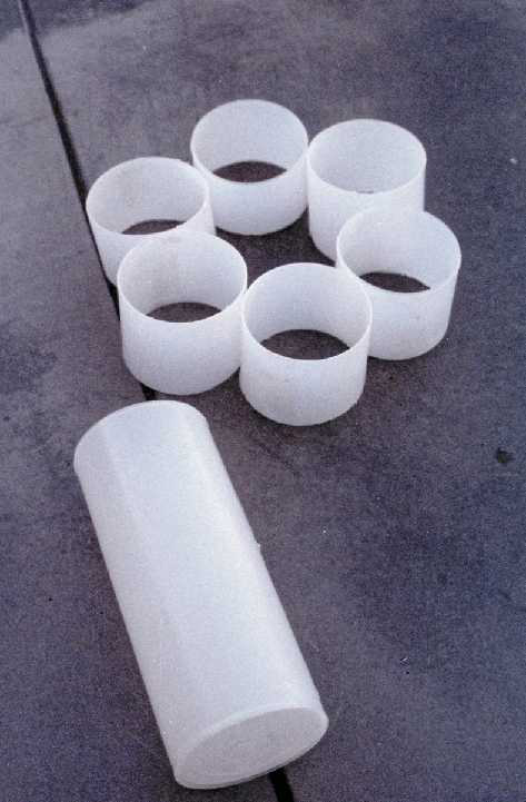 Tea-Bird (I don't have to explain the name, right?) is my fourth tubefin built entirely out of plastic. The first two (Fahrenheit 62/5 and F.I.S.H., see EMRR articles) were constructed out of 34mm PVC plumbing conduit. The third, "CORONAry" was made from a plastic cigar tube. Why all-plastic"? Waterproof - I fly from a field on a small island. But its also cheap and strong. I used the 6" iced tea container as the body tube by simply sawing off the bottom. Two more containers were cut into 3 equal 2" pieces to use for the 6 tube fins. To complete the "all-plastic" theme, I hogged the centering rings out of the plastic caps and sawed off bottoms of the plastic containers and laminated them together in triple thickness; in retrospect, this was more trouble than it was worth and 1/8" LOC ply rings would have been fine. Nose cone was borrowed from that Estes Executioner kit I mentioned. I used 5-min. epoxy thoughout, and before gluing anything, I washed all the parts in warm soapy water and gave them a wipe with some old rotgut vodka I use to clean plastic parts; this is to remove plasticizer and manufacturing residue. Also before gluing, the very shiny, smooth surface was roughed with sandpaper to improve the epoxy joints.