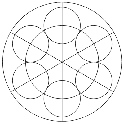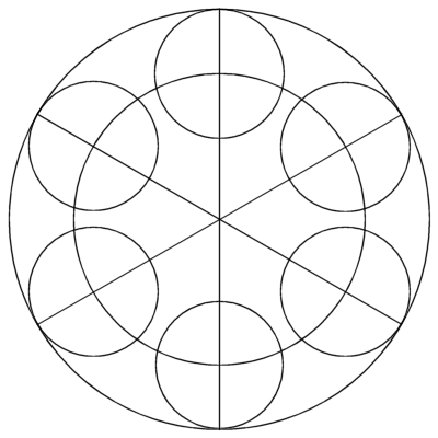 Make a cardboard centering ring to accommodate the six motor mounts inside a BT-80. Draw a circle 65mm diameter using compasses. Use a protractor to mark six points at 60 degree intervals, then draw three lines across the circle through the center and opposed pairs of points to divide the circle into six. Draw another circle 45mm diameter. At each point where this circle intersects one of the lines, draw a circle 20mm diameter. Depending on the thickness of cardboard you are using, you may wish to make two such rings and glue them together for strength.