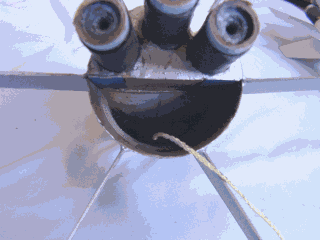 Bore a small hole in the forward centering half ring of the ejecting motor mount, pass the kevlar cord through the hole, then tie the cord to one of the motor tubes. Seal the hole with glue. Ensure that the ejecting mount will slide in and out of the booster; if necessary, sand the centering half rings lightly.