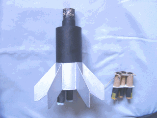Cut 140mm of BT-20 to make the motor mount. Remove the clay nozzle from the spent 18mm motor, then glue it into the front end of the tube so that the front end of the spent motor is 5mm inside the tube. Cut four strips of 1/8" balsa 70mm x 13.9mm (the thickness is the difference between BT-55 inner and BT-20 outer diameters). Glue these at equal intervals around the motor tube, aligned lengthwise, one end level with the top of the tube. These will support the motor tube instead of centering rings, making the rear end of the booster into a vent to prevent premature separation of the next stage. You may wish to paint the motor tube now to make it look like the exhaust nozzle. Glue the motor mount into the rear of the body so that the tube extends past the rear of the body by 40mm, i.e. there should be 30mm clear inside the body before the balsa supports.