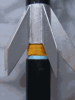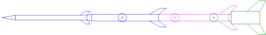 Roll and glue a tube of heavy paper, of sufficient diameter to slide easily over the motor tube, 60mm long. Make four centering rings to fit this tube, outer diameter 31.5mm. Glue one ring level with the forward end of the tube, and one ring each at 2mm, 28mm, and 32mm from the forward end. Cut two strips of heavy paper, 2mm x 99mm and 4mm x 99mm, and wrap these round the forward and middle pairs of centering rings respectively. The whole assembly should slide easily in and out of a BT-55. Cut one more centering ring, outer diameter 32.5mm, and glue this level with the rear of the tube. Then glue the whole assembly into the forward end of the body so that 30mm protrudes from the front; this should include the forward ring and half the middle ring. This is the coupler to Stage 3. Cut a strip of Nomex 300mm x 25mm and tie it to the coupler using the kevlar shock cord.