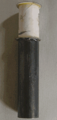 Cut 115mm of BT-20 to make the motor mount. Cut one spent 18mm motor in half to make a thrust block. Glue the thrust block into the front of the motor tube so that, when the second spent motor is inserted into the rear of the tube, it will touch the block with about 5mm sticking out of the tube. Make two centering rings to center BT-20 in BT-50. Glue one near the front end of the motor tube, and the other 66mm from the rear end. You may wish to paint the motor tube now to make it look like the exhaust nozzle. Glue the motor mount into the rear of the body so that the tube extends past the rear of the body by 40mm, i.e. there should be 25mm clear inside the body before the aft centering ring.