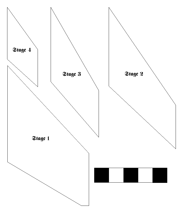 For venting, there are small holes in the top of stage 1. Half the motor mount ejects from the rear along with a small parachute. The other three motor tubes are separated by partitions so that if one motor fails to ignite, the others don't ignite it from the front when they burn out. Stages 2 and 3 have their motor mounts held in place, not by the usual centering rings, but by strips of balsa with thickness equal to the difference between the outer radius of the motor mount and the inner radius of the body tube. The gap between the motor mount and body tube thus becomes a vent which is not visible when the rocket is assembled. Stages 2 and 3 are recovered by tumbling, with small Nomex streamers to destabilize them so they don't lawn-dart. Stage 4 is recovered with a conventional streamer.