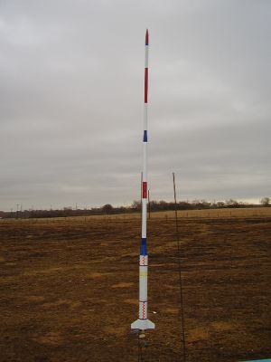 Earlier this year, I bought Sky's Longmarch 3 from Apogee. The rocket was a simple build with a distinctive look to it and, while it would not win any contests, I was quite happy with it. It did, however, have a few problems. One was the extremely large chute, 20" I think, which caused it to drift too far. That was seldom a problem because the shock cord usually failed and the thing would plummet to the earth none the worse for wear.
