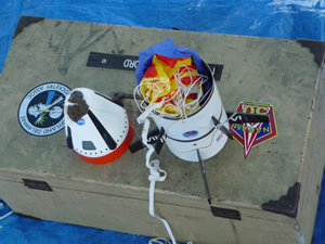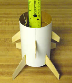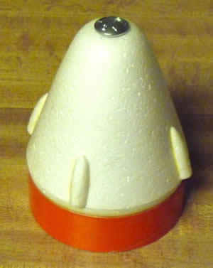 The nose cone assembly consists of the foam capsule, a shoulder and a laser cut cardboard bulkhead. A heavy lag bolt is installed in the tip to provide the required nose weight. This bolt is also the attachment point for the nose cone's parachute. A second, very thin Kevlar® cord is tied around the bolt and is fed into the body when the 'chutes are installed. Attaching the cord to the bolt should keep all the parts together on recovery and will allow the cone to come down base first. The final step is to install the faux thrusters on the nose (which were faux on the real thing too). Here, you split the two foam MMX cones, sand to fit, and glue them on the capsule.