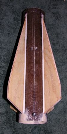 The redwood was placed in a flat cutout and coated with many layers of Partall wax #2 and PVA #10 mold release. Over this, I laid strips of 6oz S-weave fiberglass with one layer of 1.5oz fiberglass matting in the middle. After releasing the half-cone and repeating the process, I clamped the two halves together and filled the interior seam with a filling of chopped fiberglass and epoxy. Then I laid more fiberglass matting in the interior. Cutting away the flashing and sanding it round, I had my rough cone.