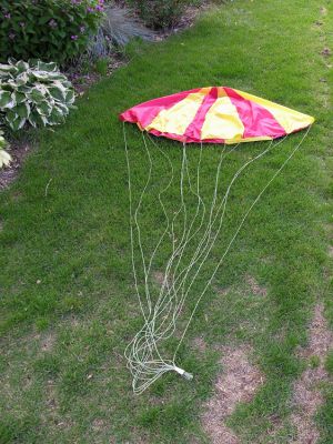 I sewed the chute myself. It was 72in diameter, 12-gore semi-elliptical in the Nakka design. It was finished with 85 feet of 3mm climber's cord for shroud lines and attached with 20ft of half-inch tubular nylon.