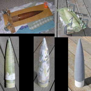 I began with the nose cone, using the redwood cone to lay up fiberglass. Unlike many people, I laid the fiberglass over the cone and used this shell directly for the cone rather than as an inverse mold for another layup. Both the inner and outer diameter of the nose cone were slightly too small compared to the body tube, which caused problems later.