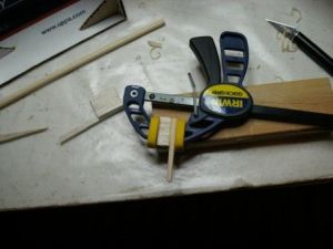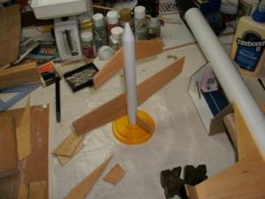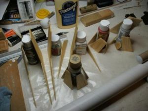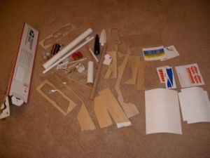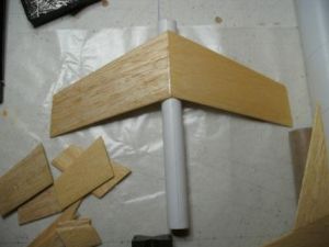 While that assembly dried, I began cutting out fins. (You can use the template supplied to cut out all the balsa pieces.) Assemble the main wings by gluing the wing front to the wing. After this had dried, I sanded and sealed all the fins. I prefer to seal the balsa with a 50/50 mixture of wood glue and water and press the parts under a stack of books if they start to warp. The photo (below/right) shows all the balsa parts cut out, sanded, and drying.