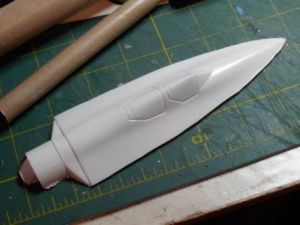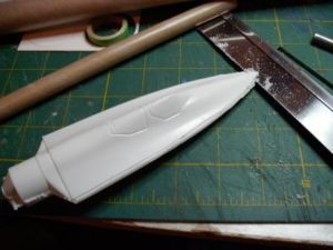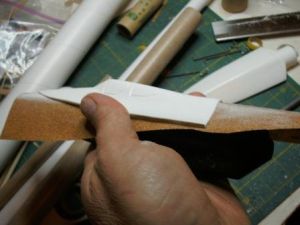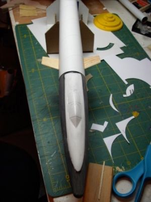 I knew I wanted to build my rocket around the 18" BT-60 body tube, and I also liked the look of the SR-71 nosecone. Unfortunately, the SR-71 cone did not fit the BT-60 tube. In order to use it, I decided to cut the cockpit portion off of the nose cone and blended it into the BT-60 nose cone by wrapping sandpaper around the bigger cone and sanding the cockpit to fit . When the shapes were in contact all the way around, I glued them together with liquid plastic cement.