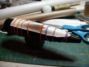 Next, I glued these boosters to the main body using a technique I learned from Quest Rocketry's Force 5 kit. Laying the main tube on a flat surface and with the engine hook up, I placed the two boosters on the sides of the main tube, and flat on the table. Next, I applied a bead of glue down the booster tubes and rotated them until the glue was in contact with the main tube.