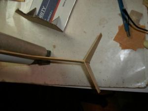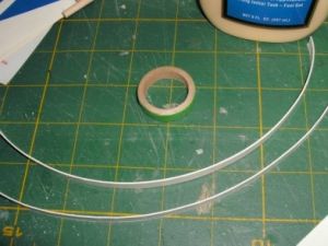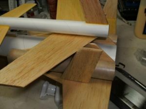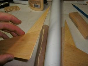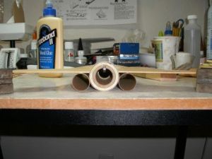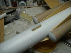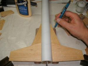 While that assembly dried, I began work on the glider. First I took the 7-½" BT-20 tube and marked it with 4 lines 90 degrees a part. Extend these lines the entire length of the tube. With one line face-up I glued the wing halves together ½" from the tube end sanding the root edges for a good fit, and letting the wingtips rest on the work surface to form a natural dihedral.