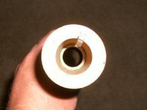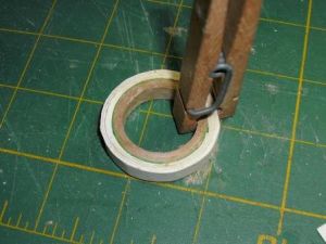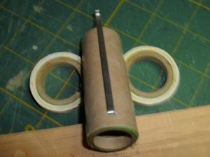 I knew a model of this size would need a large motor to get it into the air so I wanted to use the BT-50 tube for a motor tube. Unfortunately, I did not have BT-50 to BT-60 centering rings, so I made them by wrapping strips of the card stock around the BT-50 to BT-55 centering rings. I constructed a standard "D" size motor mount from a 2-3/4" piece of BT-50, the thrust block and engine hook. I then glued this assembly flush with one end of the BT-60.