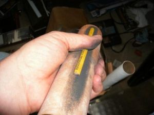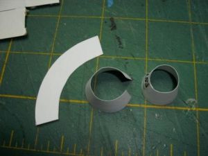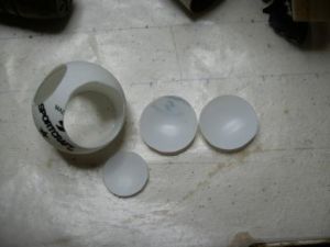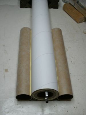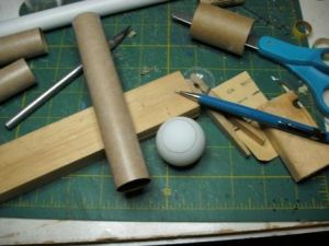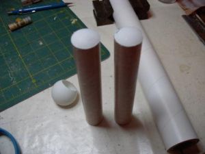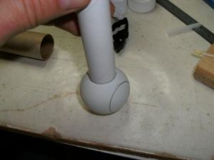 Next, I made the booster engines by cutting two pieces of BT-50, 6" long each. I then traced the tube onto one of the ping pong balls (the first bonus item) and cut out two end caps. I then cut them out and glued them to the ends of the boosters with epoxy.