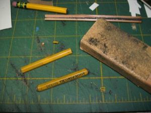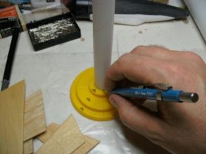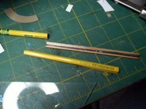 The two gun pods were made from a pencil (the fourth of the surprise parts). First I split a 6" length of pencil in two. Then I wrapped a piece of sandpaper around a piece of BT-60 and sanded the inside of the pencil so that it would rest flush with the body tube. Next, I cut the pencil into two 3" long pieces and tapered the ends. These two pieces were glued to the underside of the model approximately 60 degrees apart.