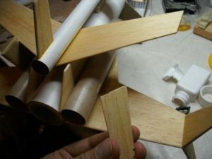 While the glider wings dried, I glued the wingtips onto the wing of the mothership. The exact angle of the tips isn't critical, but I tried to make them all even. I cut a cradle out of the Priority Mail tube and used it to hold the model as it dried.