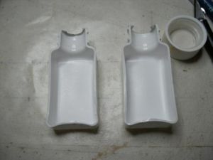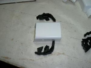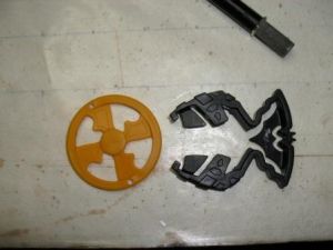 Two of the surprise items were a pill bottle and a cereal box prize. I used a square pill bottle and a Batman disc launcher to make an air scoop.