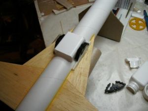 The glider rests on these strakes and is hooked to the booster by a 1" long piece of launch lug and a hook constructed from a dowel and a balsa stand-off. The launch lug is glued along the top center of the model 6-¼" from the back of the tube, and the hook is glued to the glider along the wing center line and flush with the front. The exact size of the stand-off took a little trial and error to get the glider rest parallel to the mothership's wing. Start with a stand-off about 3/16" for the launch lug and a 3/8" for the dowel. Tape them in place and check that the glider rests correctly. If not, sand them until the glider rests in line with the main wing so that the glider will not distort the flight path of the rocket. When dry, place the glider on the mothership, and place the rudders/glider support fins against the boosters. Mark the rudders where the glider wings cross them. At this mark, cut a notch into the fins and glue them in place so that the notch holds the glider wing stable during boost.