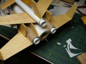 Next, I glued the wings to the main body. I marked where the wings crossed the boosters. Then I applied glue to the wing root and along the booster up to the mark. The photo (below/center) shows the way the wings and boosters go together with the three body tubes flat on the table. I supported the wingtips in this configuration until they dried.